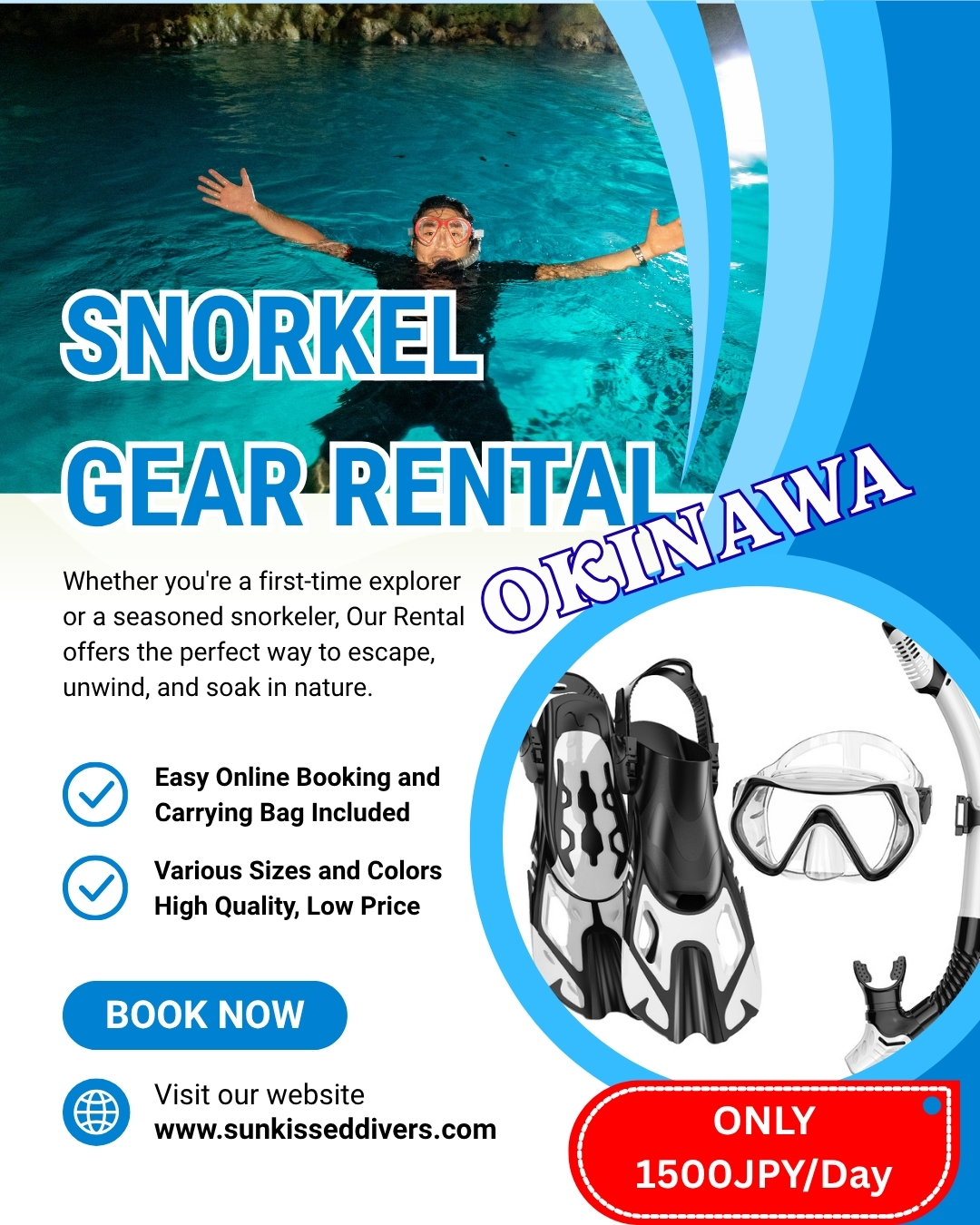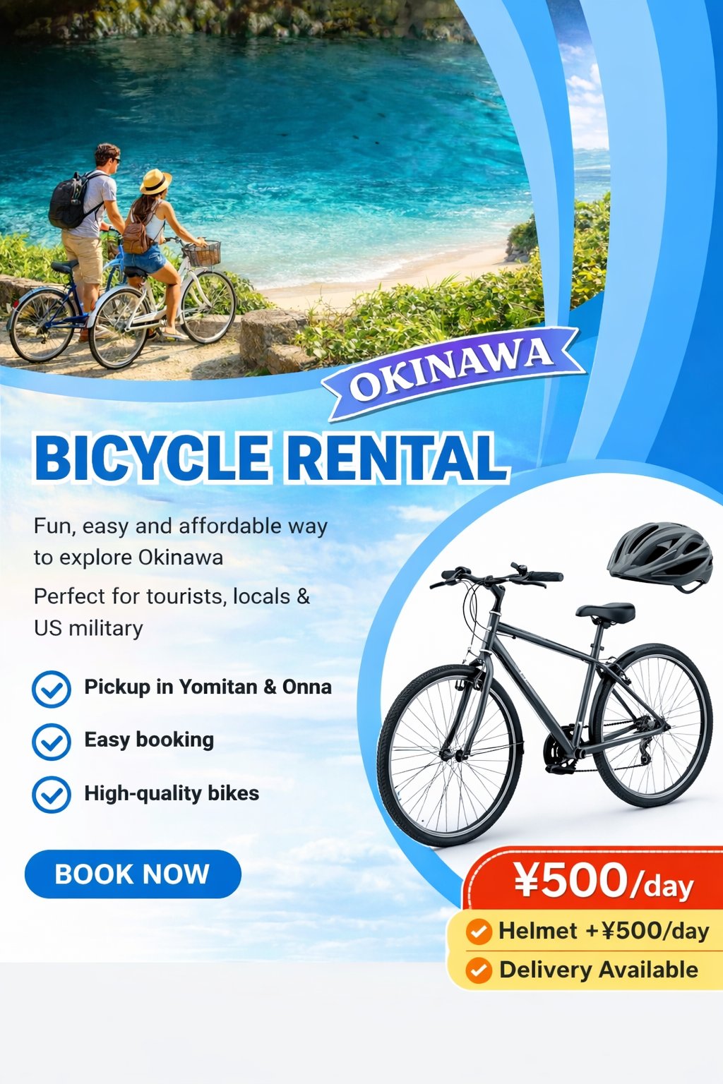 Dive into Okinawa’s crystal-clear waters or explore its scenic landscapes on two wheels! Rent our premium snorkel gear or bicycles for an unforgettable adventure. Each snorkel set includes fins, mask, dry snorkel, and a carry bag—meticulously cleaned and maintained for your comfort and safety. Our bicycles are well-maintained and ready for smooth, scenic rides. Experience Okinawa’s underwater wonders and vibrant landscapes with ease and confidence.